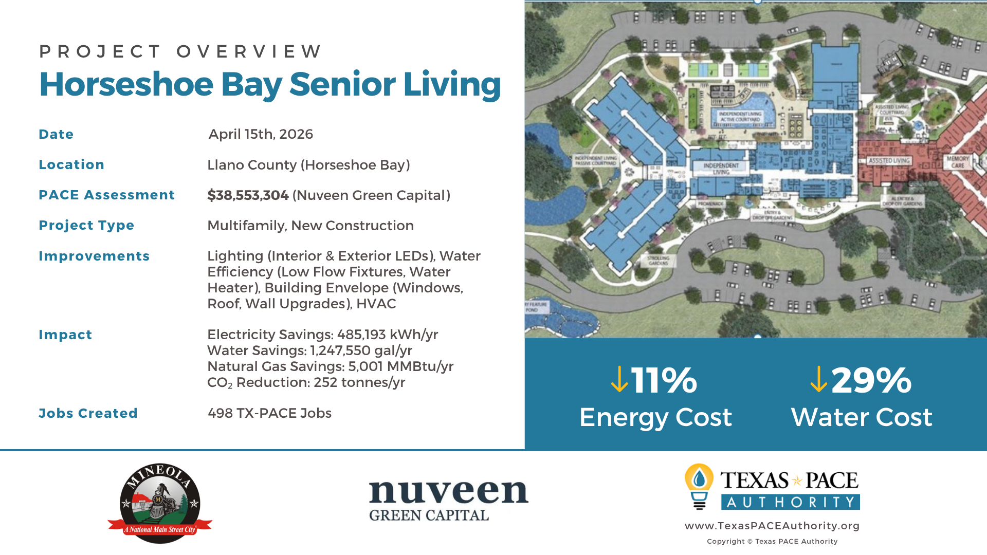| Horseshoe Bay Project, 2026 Multifamily, New Construction View Project Overview | Llano County (Horseshoe Bay) | Nuveen Green Capital | $38,553,304 Lighting (Interior & Exterior LEDs), Water Efficiency (Low Flow Fixtures, Water Heater), Building Envelope (Windows, Roof, Wall Upgrades), HVAC |
