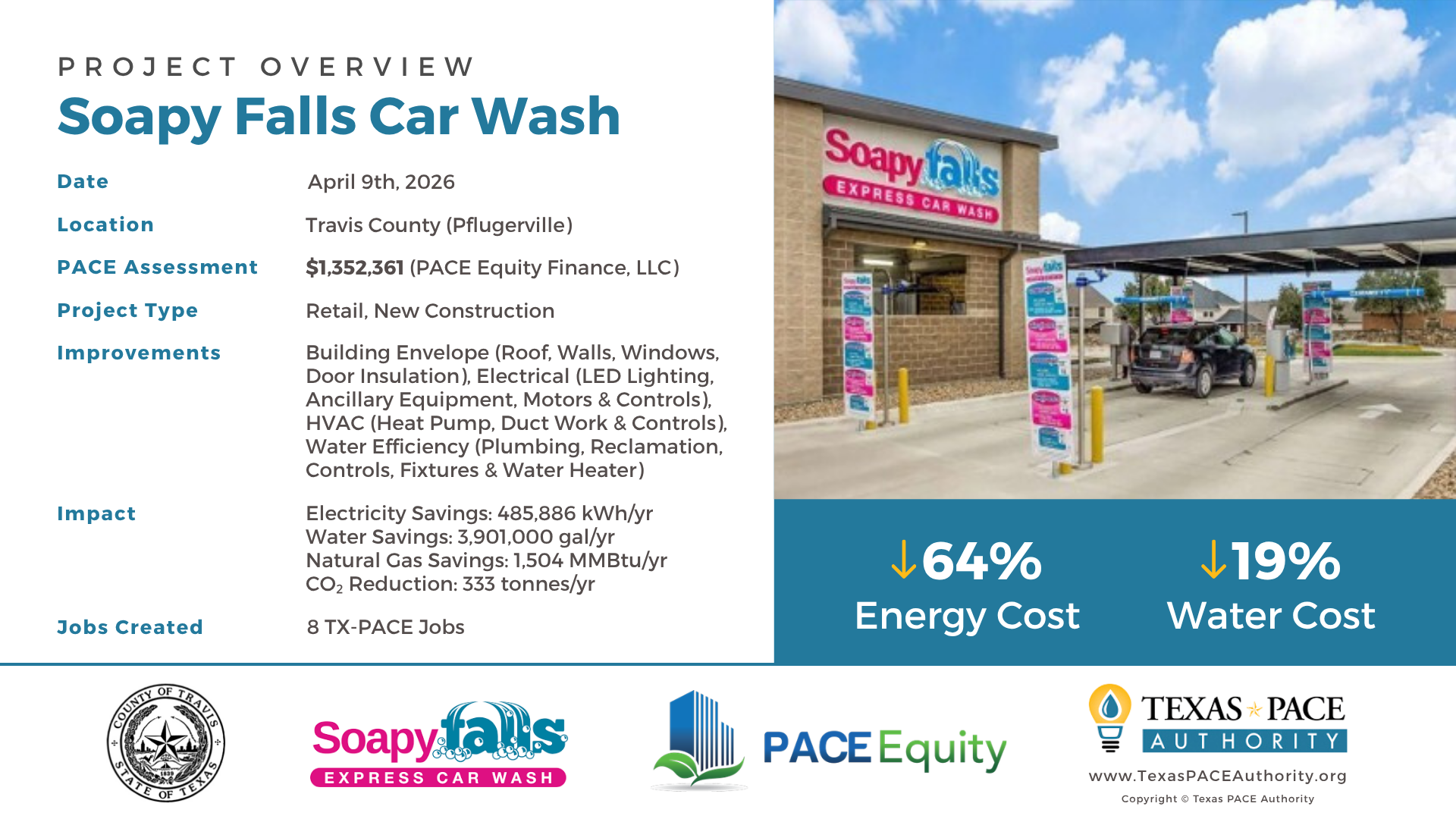 ![]() | Soapy Falls Car Wash Pflugerville, 2026 Retail, New Construction View Project Overview | Travis County (Pflugerville) | PACE Equity Finance, LLC | $1,352,361 Building Envelope (Roof, Walls, Windows, Door Insulation), Electrical (LED Lighting, Ancillary Equipment, Motors & Controls), HVAC (Heat Pump, Duct Work & Controls), Water Efficiency (Plumbing, Reclamation, Controls, Fixtures & Water Heater) |